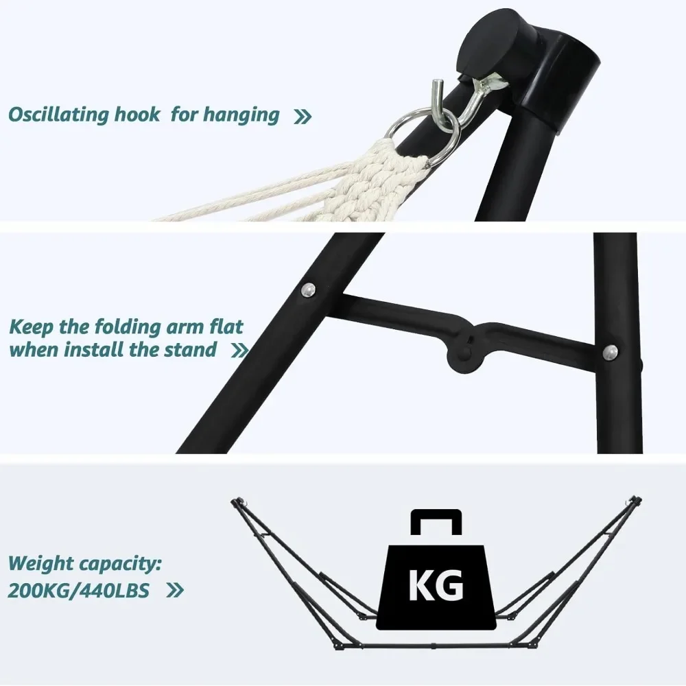 - Easy to Assemble :Hammock stand can be easily set up or take it down in just a few minutes without tools. Removable screw design, with the adjustable hooks on the stand, you can decide how low or high the hammock to swing.Both backyard and portable hammock stands are easy to set up and hang your hammock from. And you don’t need to measure the distance between anchor points.Free yourself from head to toe and enjoy the fun of the hammock stand.