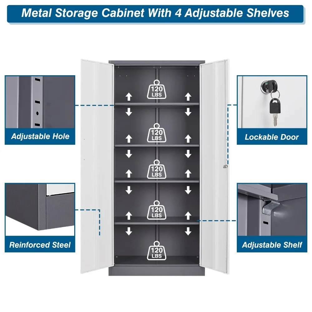 - All-Steel Druable Material- This metal storage cabinet is manufactured with a heavy-duty steel frame, which the overall steel frame can be up to 0.8mm thick, allows each shelf to hold up to 120 pounds when in use. The surface is sprayed with environmentally friendly paint, which can resist scratches and corrosion for long-term no-worry use.