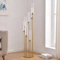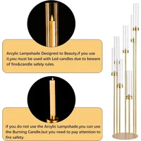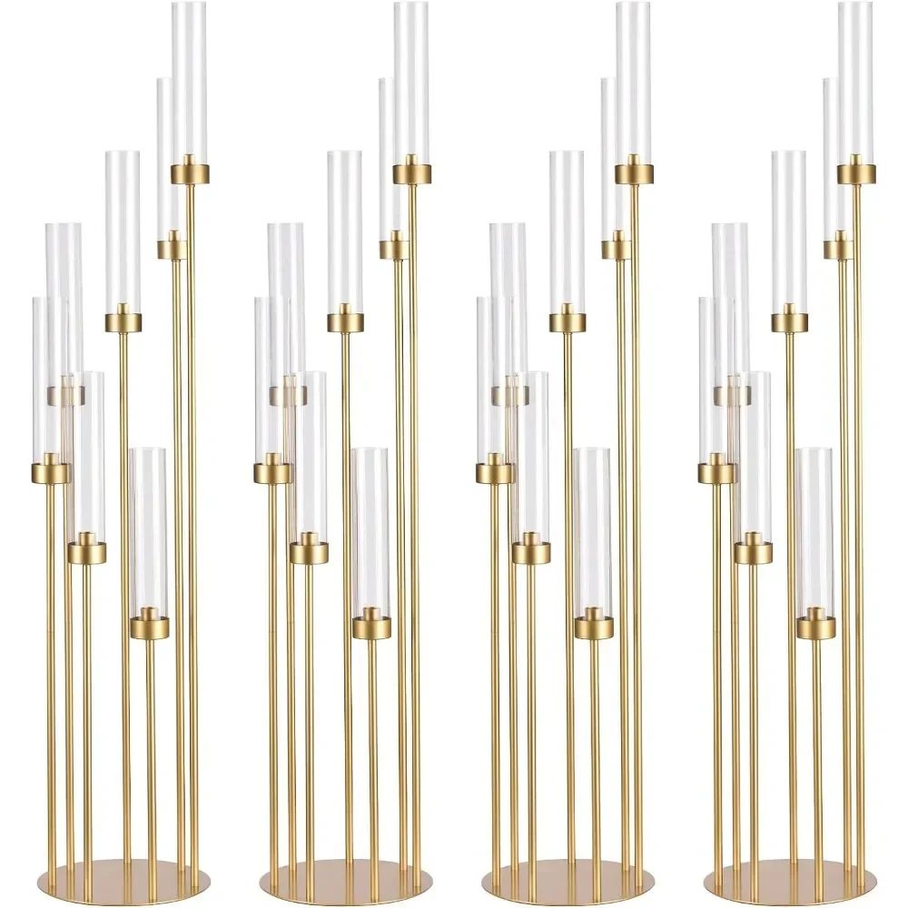 - Quantity: 4 Packs Candle Holder Centerpiece Material: Metal Color: Gold Style: 7-Arm w/ Thick Round Base Overall Height: 48″ Arms Heights: 24.6″, 28.5″, 32.4″, 36.2″, 40.2″, 44″, 48″,Base Size: 9.36″Dia. Candle Cups Size:0.98″ Dia. Note: Candles and other accessories are not included!